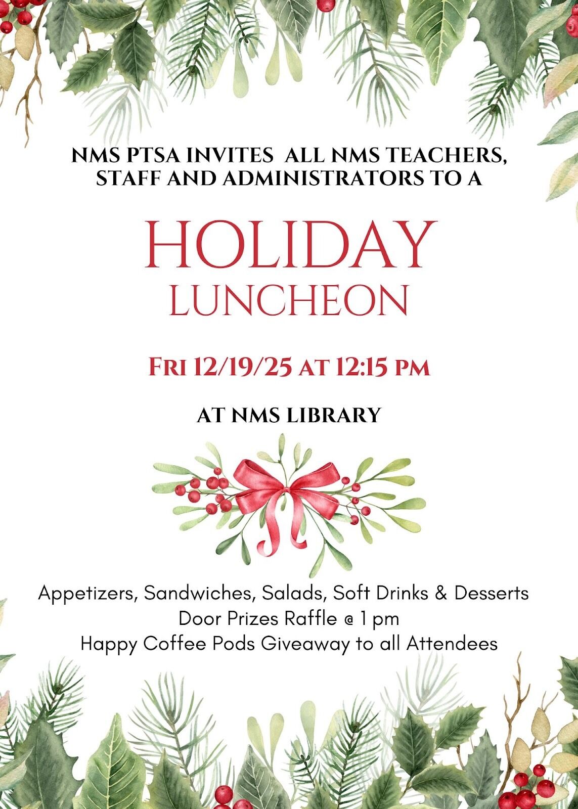 To celebrate their hard work and dedication, the NMS PTSA is hosting a Teacher and Staff Holiday Luncheon on 12/19/25 at 12:15pm (right after the school ends).